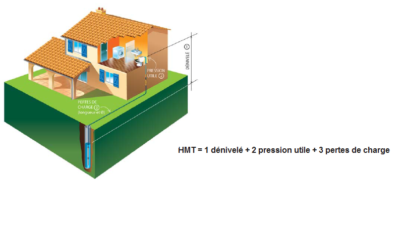 L'autre caractéristique d'une pompe immergée, c'est sa hauteur manométrique totale (HMT), exprimée en bars ou mCE (mètre colonne d'eau). La HMT est la pression totale que devra fournir la pompe immergée : elle équivaut à la somme de la hauteur de refoulement, de la pression utile et des pertes de charge. En effet, une pompe immergée doit refouler à un niveau supérieur, l'eau qu'elle a puisée, en luttant contre les pertes de pression liées aux frottements, et à un niveau de pression satisfaisant en sortie d'eau. Cette pression, dite pression utile, est généralement de 1 à 4 bars pour un usage domestique.