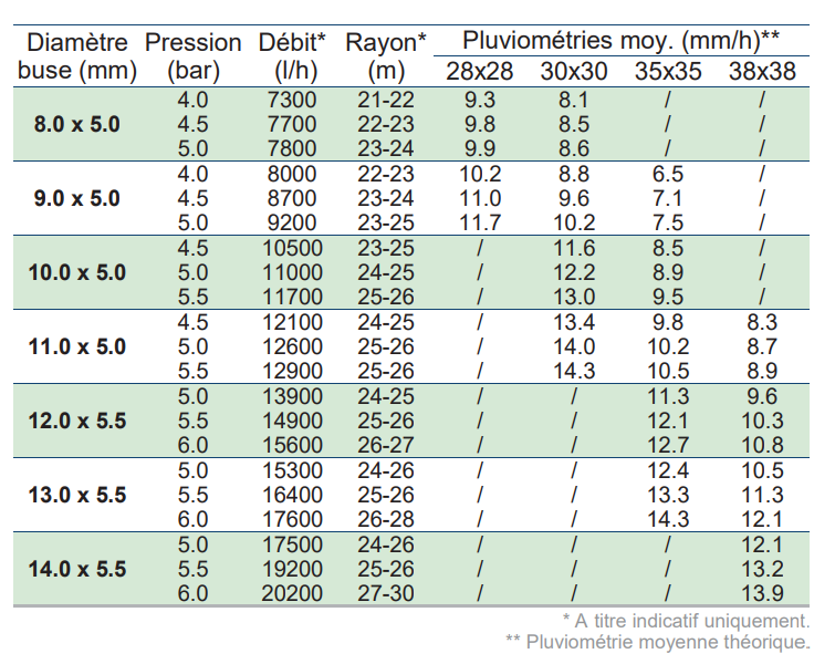 - Diamètre des buses : buse motrice de 5.0 à 5.5 mm, buse projectrice de 8.0 à 14.0 mm