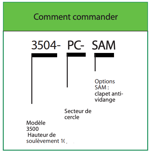 - Modèle SAM (Seal-A-Matic™) : Clapet anti-vidange retenant jusqu’à 2,1 m de colonne d’eau, prévenant le flacage aux points bas.