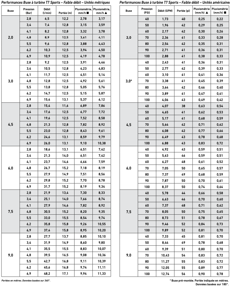 L'arroseur T7 (T7P) est conçu pour être robuste et capable de résister aux conditions difficiles rencontrées sur les terrains de golf. La version à faible débit est particulièrement adaptée aux applications sur les départs, les tours de greens et les périphéries de terrains de golf à faible portée. Il a été conçu et testé pour offrir un niveau élevé de fiabilité qu'exige le marché.
