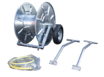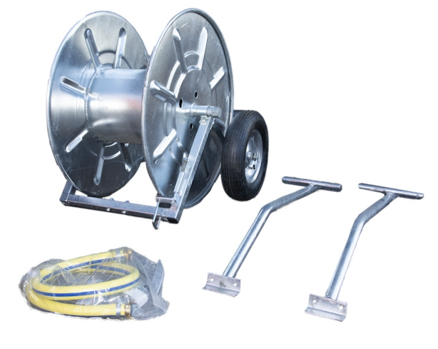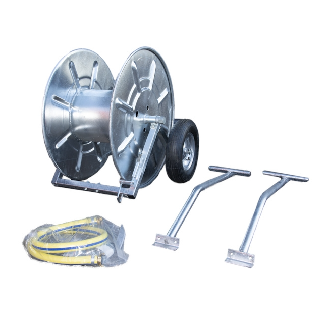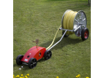 Attelage enrouleur de tuyau de l'arroseur automoteur REMO 3T FECO. Tuyau 1'' jusqu'à 120m. Dévidoir avec écoulement et articulation en laiton. Frein à tambour. Flèche d'attelage. Pneumatiques 400/100. Galvanisé.