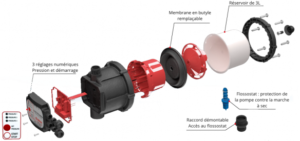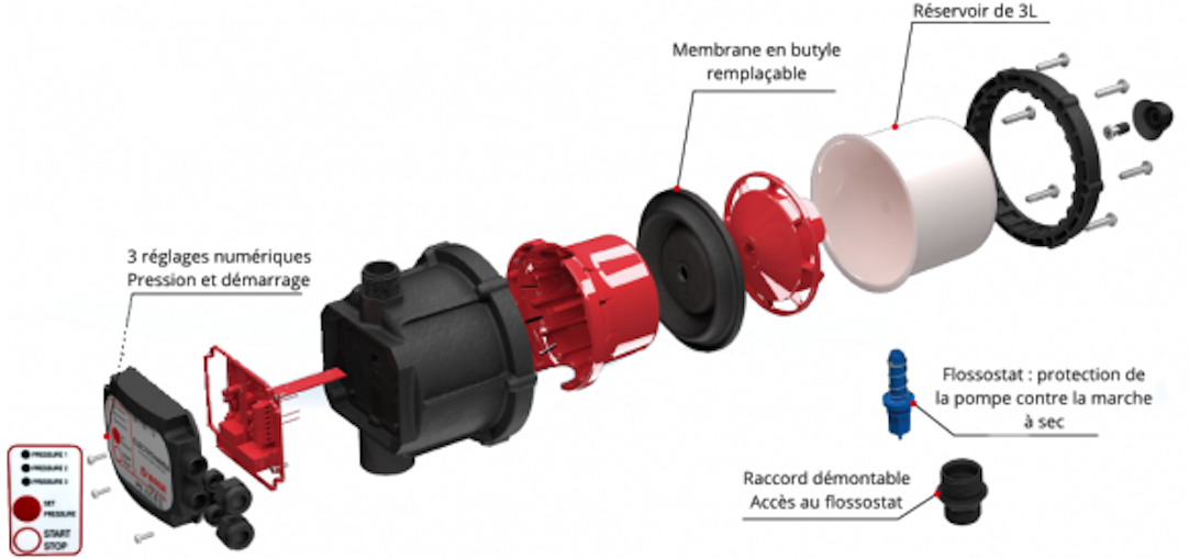 Il est idéal pour automatiser les pompes de surface jet, centrifuges et immergées. Il possède également un réservoir intégré de 3 litres qui permet de supprimer les coups de bélier lors du démarrage de la pompe et réduit les démarrages répétitifs.