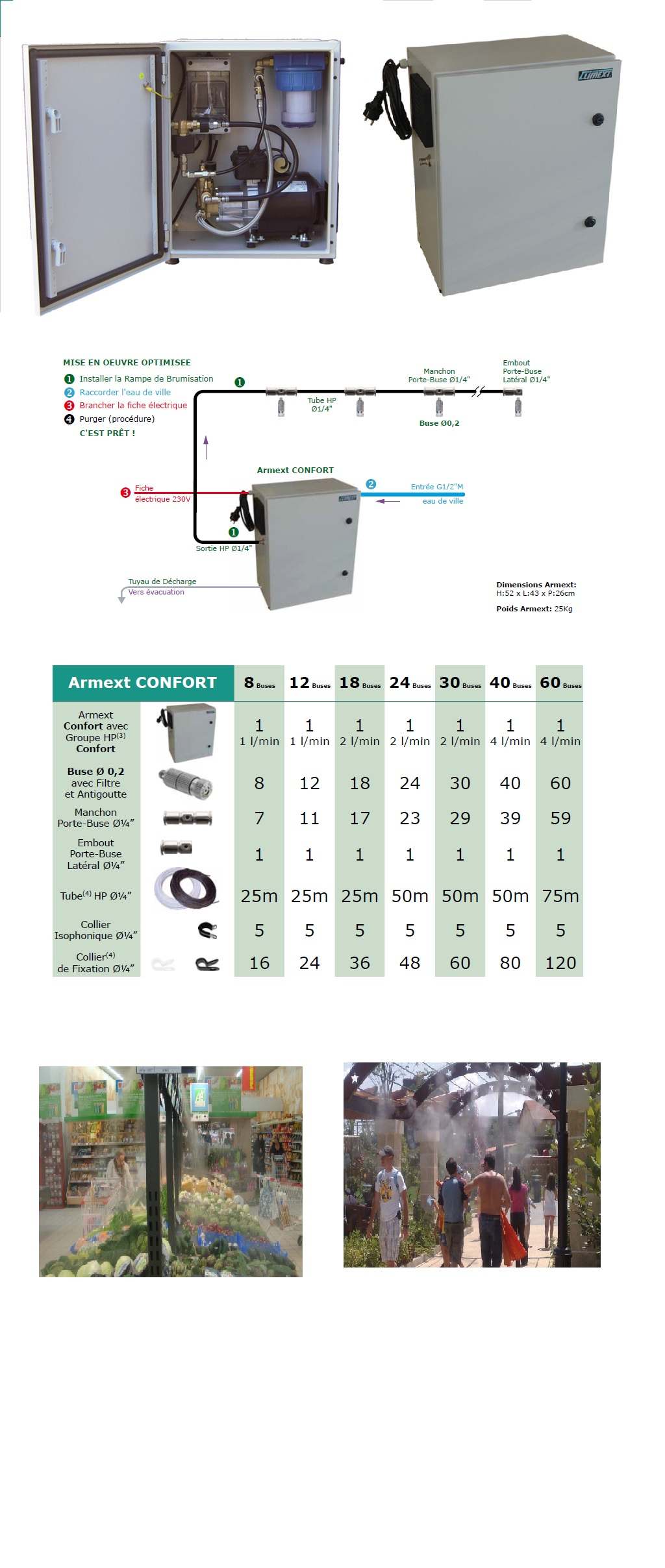 | Référence Brumisateur | Armext Confort 8 buses, Armext Confort 12 buses, Armext Confort 18 buses, Armext Confort 24 buses, Armext Confort 30 buses, Armext Confort 40 buses, Armext Confort 60 buses |