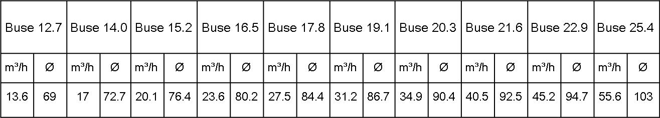 | Type de buse SR 100 | 12.7, 14, 15.2, 16.5, 17.8, 19.1, 20.3, 21.6, 22.9, 25.4 |