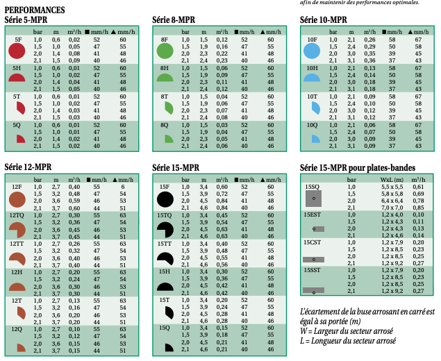 - Uniformité Totale (MPR) : Taux de précipitation identique quelle que soit la buse utilisée sur le circuit.