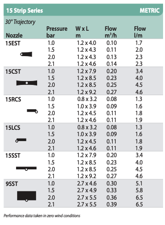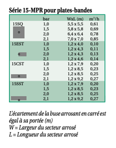- Type de Buse : Fixe (angle non réglable), à taux de précipitation assorti (MPR), à jet rectangulaire