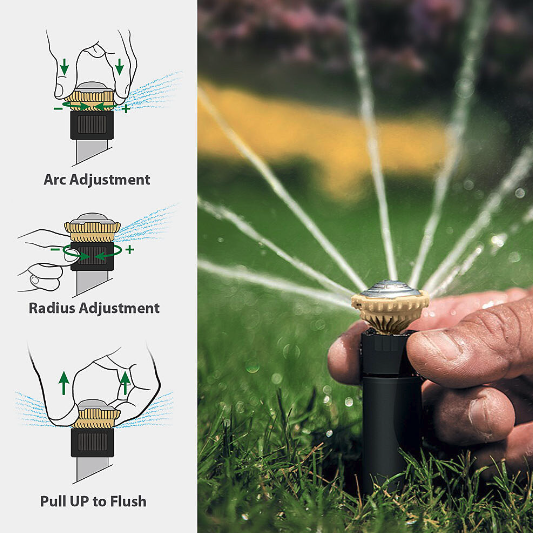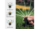 - Réglage sans outil : secteur et portée ajustables directement à la main, en cours d’arrosage.