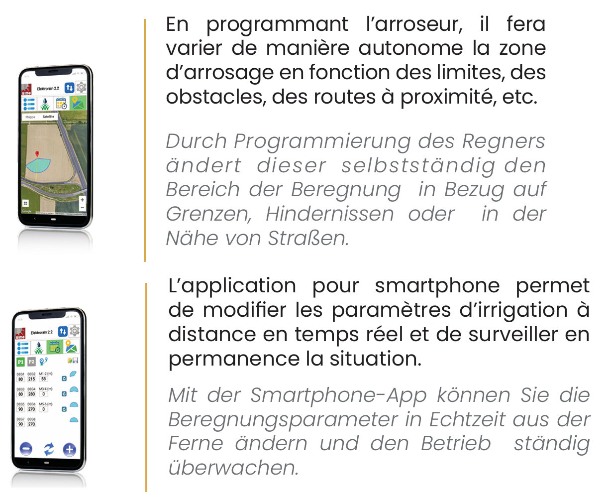 Découvrez le canon d'arrosage électrique ELEKTRORAIN, conçu pour optimiser l'irrigation de vos parcelles, même les plus irrégulières. Équipé d'un système GPS, il est idéal pour une utilisation avec des enrouleurs ou des pivots. Ce canon intelligent est doté d'une unité de contrôle électronique gérable via une application sur smartphone, vous permettant de modifier les paramètres d'irrigation à distance et en temps réel, ainsi que de surveiller le fonctionnement en continu.