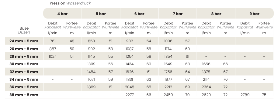 - Débit : de 761 à 2789 L/min (selon buse et pression)