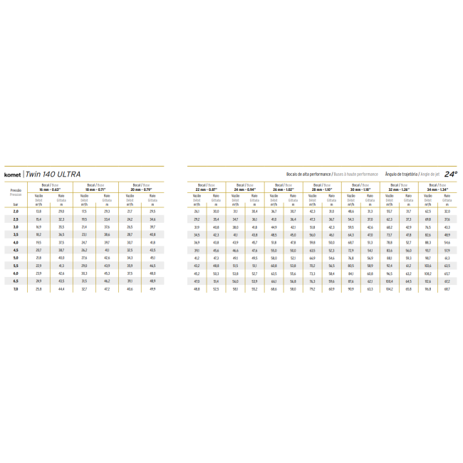 Angle de trajectoire de 21° - Débit de 22 à 77.3 m³/h - Portée de 27 à 63 m