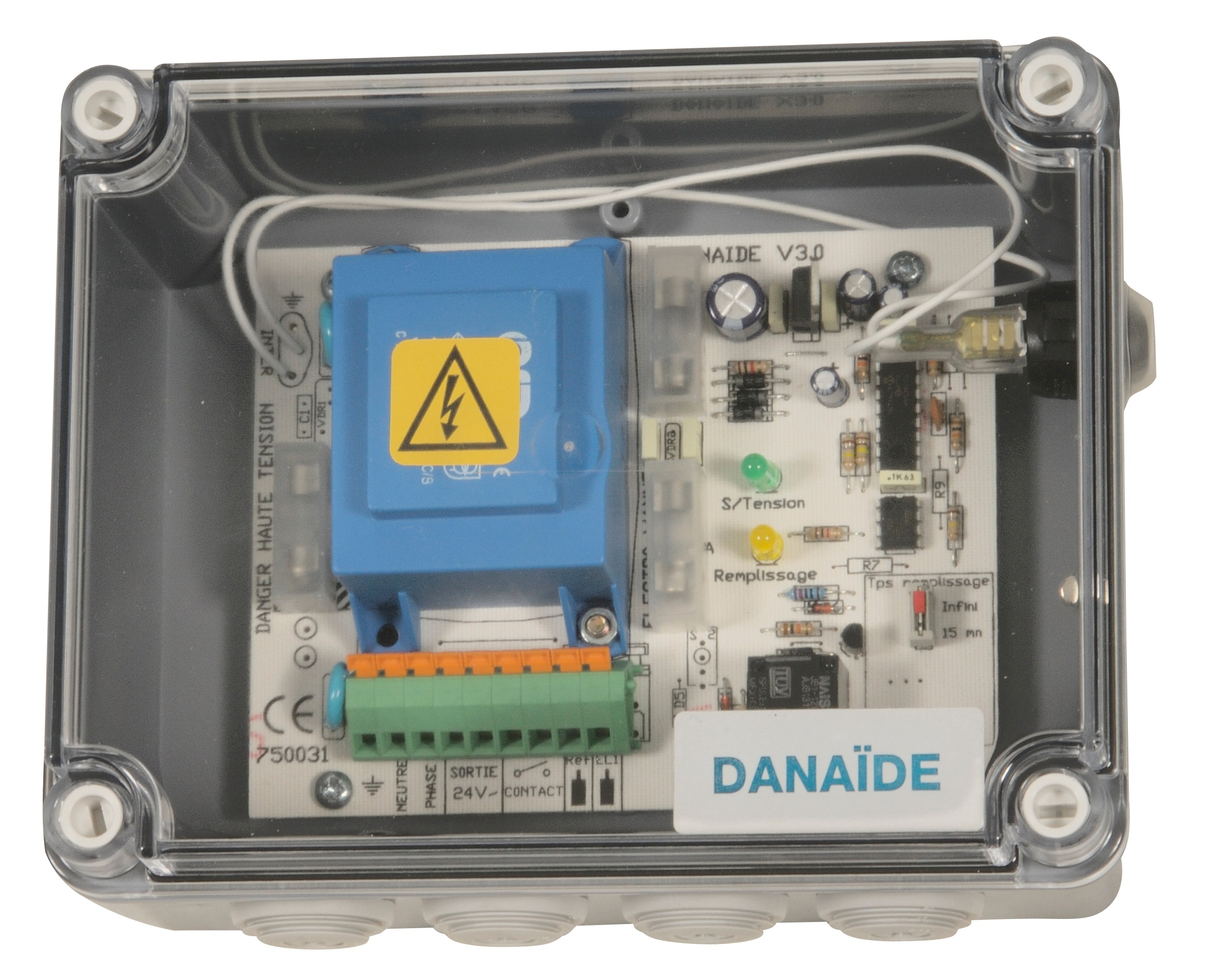 Le coffret Danaïde assure la gestion du niveau d'eau à partir d'une électrode. Il permet de maintenir un niveau constant, déterminé par le positionnement d'une électrode, pour toute réserve d'eau soumise à déperdition lente (lacs, bassin, piscine, fontaines...). Dans le cas où le volume d'eau dont on mesure le niveau est isolé de la terre il sera nécessaire de prévoir une deuxième électrode (potentiel de référence). Il peut aussi servir à la régulation de niveau dans les bacs tampon de piscine à débordement ou dans les bâches de reprise. L'électrode se camoufle facilement et d'une précision que le centimètre. La compensation de niveau peut être obtenue soit par l'ouverture d'une électrovanne, soit par la commande d'une pompe.