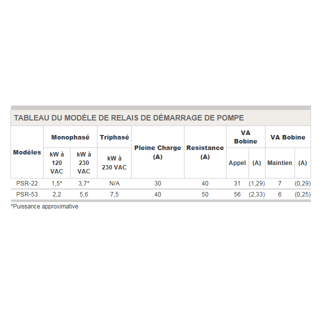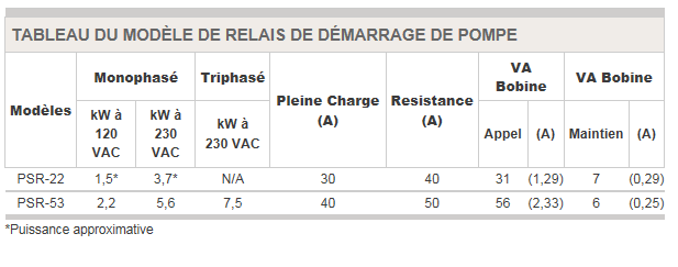 Capacité : Le PSR-22 est capable de gérer la commutation pour des pompes ayant une puissance maximale de 2,2 kW (à 230V), ou 1,5 kW (à 120V). (Les spécifications peuvent varier légèrement ; ici on utilise les spécifications du modèle bipolaire).