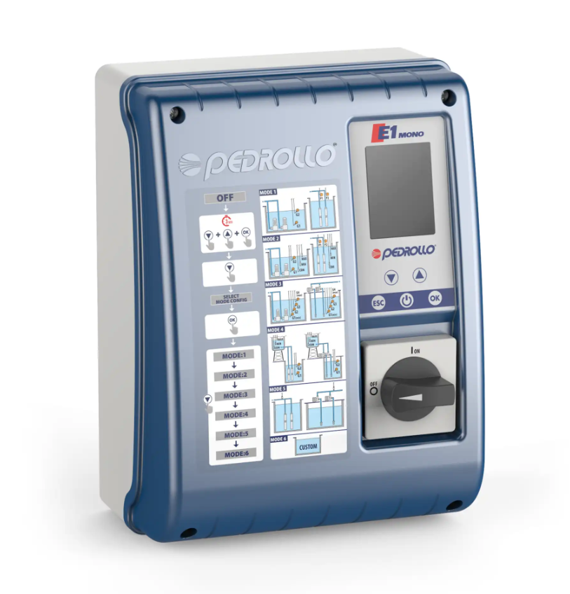 Le coffret électriques E1 Monophasés Pedrollo est un tableau de commande électronique multifonction, conçus pour assurer la gestion et la protection d'une électropompe. Adapté aux applications résidentielles, commerciales et industrielles, il offre une solution polyvalente pour la pressurisation, le remplissage, la vidange et le drainage des systèmes, qu'ils soient utilisés pour des eaux propres ou des eaux usées.