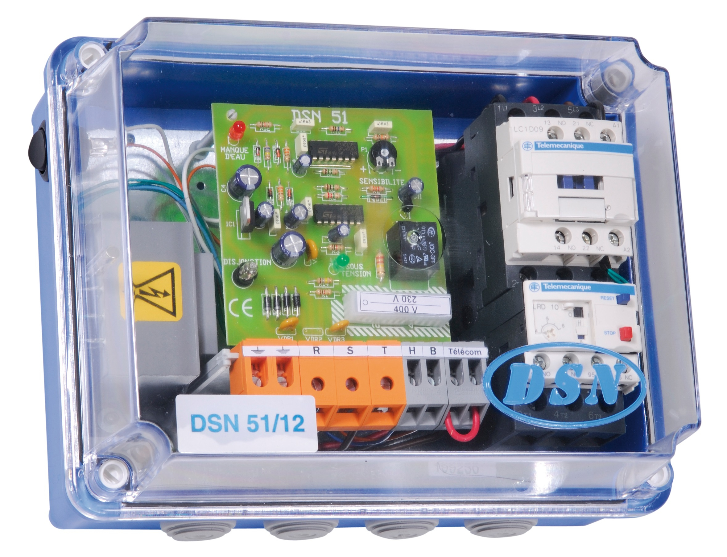 Coffret électrique bi-électrode avec visualisation du niveau critique DSN 52, assurant la gestion des niveaux d'eau dans les forages, les puits et les réservoirs, la commande et la protection de la pompe.