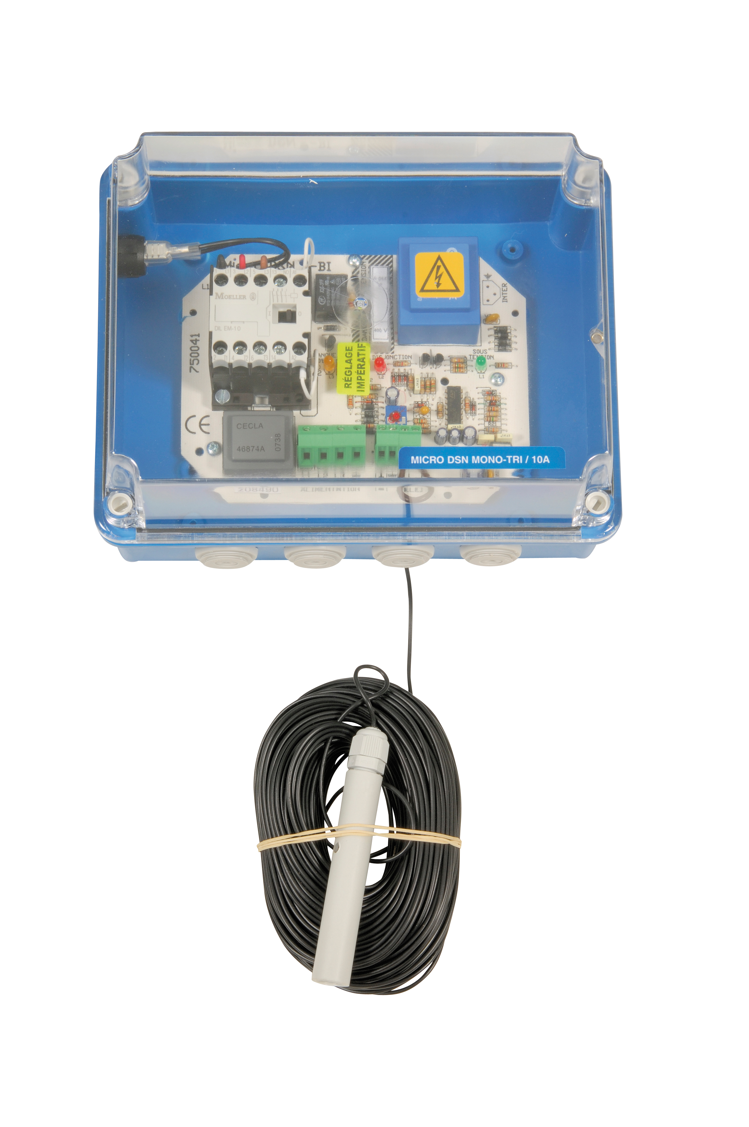 Le coffret MICRO DSN assure la protection d'une pompe immergée monophasée ou triphasée contre le manque d'eau, par contrôle du niveau d'eau avec une seule électrode.