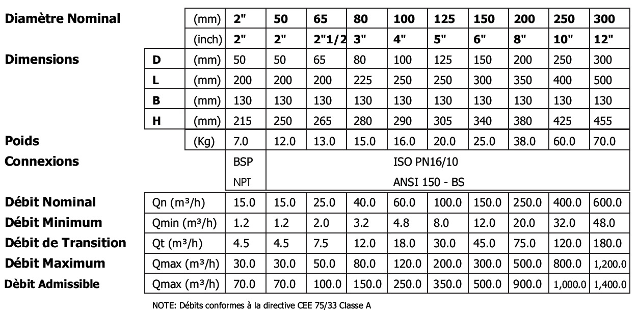 Le diamètre du compteur (DN) doit être sélectionné à partir de son débit nominal (Qn) et de la plage de fonctionnement souhaitée (Qmin/max). Un débit instantané trop faible (compteur surdimensionné) pourra engendrer une erreur importante de mesure ; un débit trop élevé (compteur sous dimensionné) réduira sensiblement sa vie utile à cause de la vitesse excessive de l'eau. Les débits caractéristiques de chaque calibre de compteur sont indiqués dans le Tableau n.1
