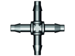 Croix cannelée 4x6 utilisée pour raccorder quatre tuyaux 1/4'' (4x6 mm) dans une application d'arrosage localisé.