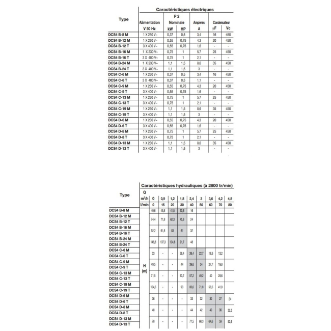 | Référence pompe immergée | DCS4 B (0,9 à 2,4 m3/h) |