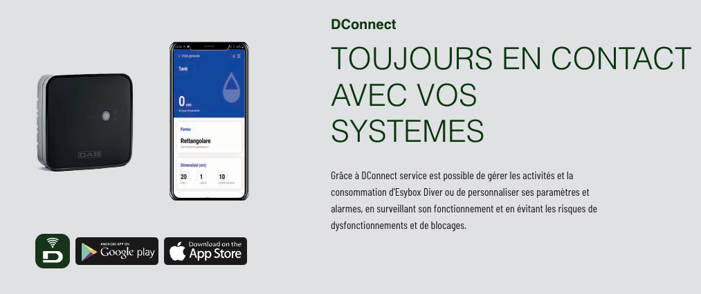 - Grâce à DConnect service est possible de gérer les activités et la consommation d'Esybox Diver ou de personnaliser ses paramètres et alarmes, en surveillant son fonctionnement et en évitant les risques de dysfonctionnements et de blocages.