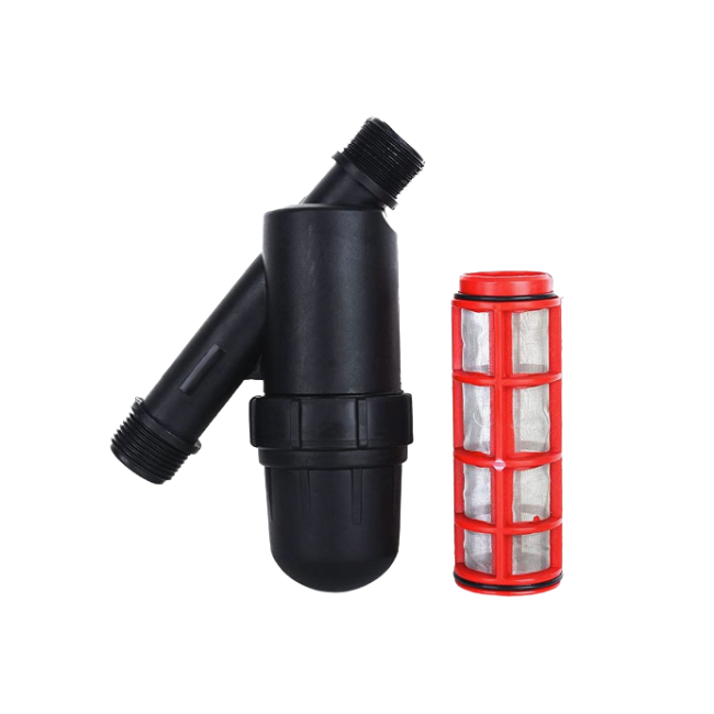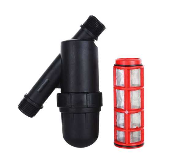 Filtre à tamis en ligne mâle-mâle,en polypropylène, résistant à 6 bars, tamis inox 130 microns.
