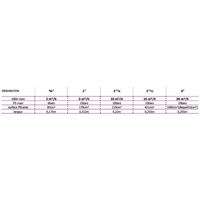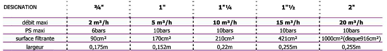 | Débit | maxi 2m3/h.,maxi 5 m3/h.,maxi 10 m3/h.,maxi 15 m3/h.,maxi 20 m3/h. |