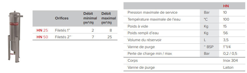 - Fiabilité : Sans pièces mobiles, le modèle HN assure une filtration continue et un faible besoin d'entretien.