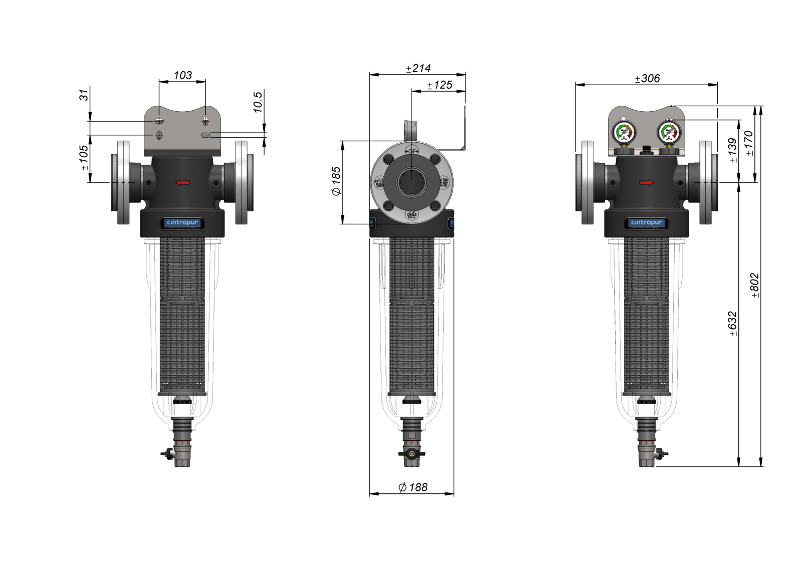Livré avec élément filtrant de 25 microns, clef de démontage, deux manomètres, vanne de purge et brides folles.