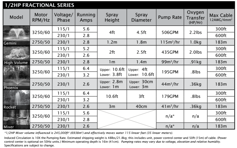 Livrée avec quatre ajutages interchangeables, elle permet de créer différents types de jets décoratifs pour sublimer vos bassins et étangs. Grâce à son moteur 1/2 HP – 220V et à son dispositif flottant, elle est idéale pour les plans d’eau de faible profondeur, dès 41 cm, et d’une surface allant jusqu’à 3000 m².