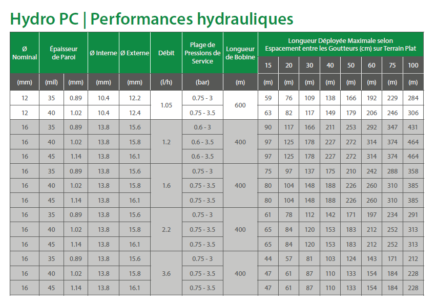 Débit : 2,2L/h - Espace entre chaque goutteur : 0,33 / 0,50 / 1,00m - longueur 400m