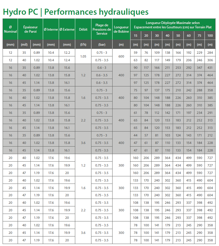 Débit : 2,2L/h - Espace entre chaque goutteur : 0,33 / 0,50 / 1,00m - longueur 300m