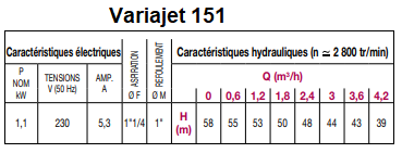 Puissance : 1,1 kW - Débit : de 0 à 4.2 m3/h - Pression : de 3.9 à 5.8 bars - Monophasée 230V
