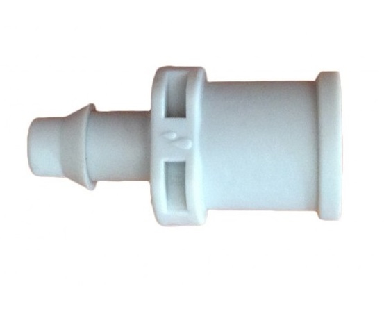 Connexion recommandée sur les pendulaires, jonction conique femelle, tubing polyéthylène SSPE (tube souple) gris, masselotte NETAFIM et clapets anti-vidange pour éviter la vidange complète des rampes en fin d'irrigation aux points bas.