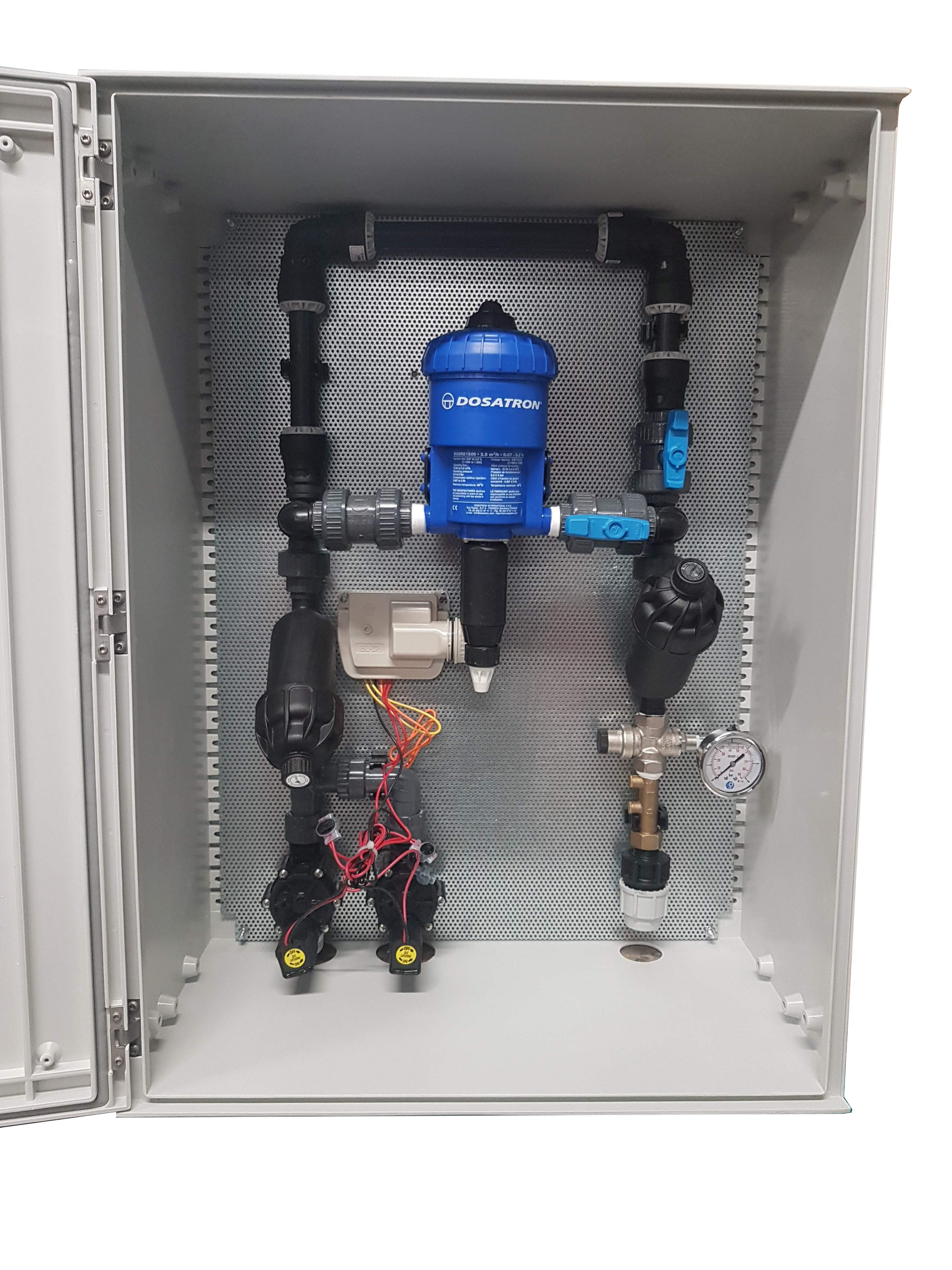 - Une pompe doseuse D25GL2 permettant l'injection du fertilisant, en dosage réglable (0.2 à 2 %) toujours proportionnel au volume d'eau qui la traverse quelque soit les variation de débit et pression du réseau + deux vannes d'isolement.
