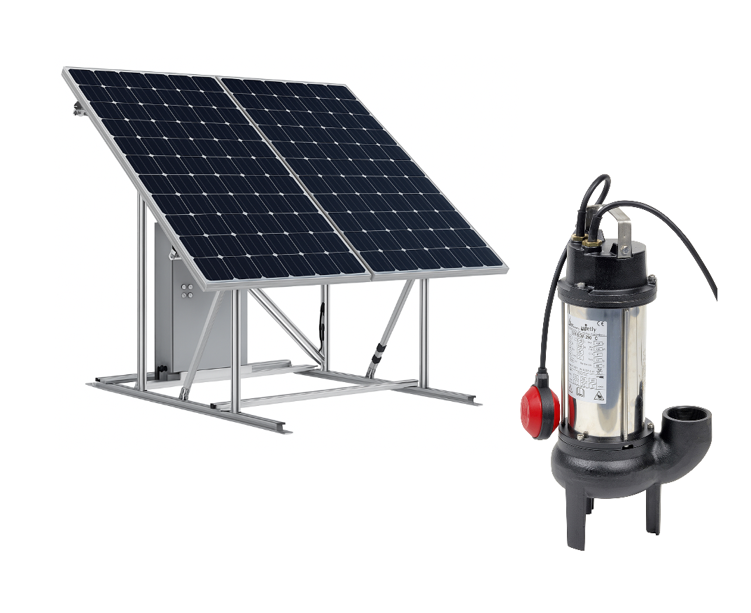 Kit de pompage solaire autonome ECOSOM 290E pour évacuation eaux chargées. Énergie renouvelable et batterie intégrée.