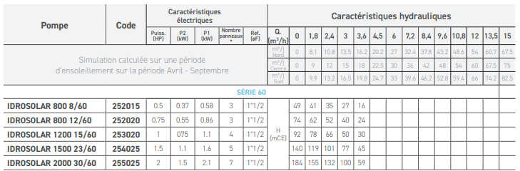 | Type de pompe immergée | IDROSOLAR série 60 |