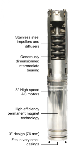 - Pompe entièrement fabriquée en acier inoxydable et adaptée aux puits forés de 3 pouces ou plus