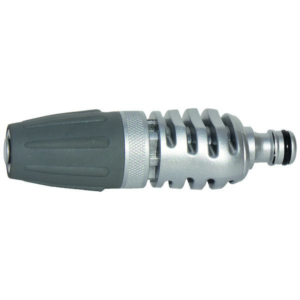 Elle est équipée d'un raccord automatique mâle standard pour un branchement immédiat et étanche à tout tuyau d'arrosage muni d'un raccord rapide femelle. Souvent dotée d'une vanne de contrôle (type quart de tour ou poignée) intégrée, elle permet de réguler précisément le débit et le type de jet (du jet concentré à la douche), offrant un contrôle total de l'arrosage.
