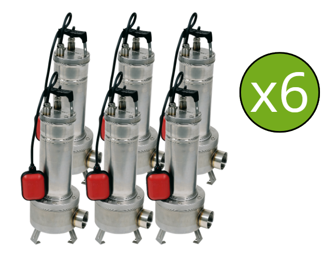 Lot de 6 pompes de relevage avec roue vortex adaptée au pompage et transfert d'eaux usées et chargées domestiques. Granulométrie de 50 mm.
