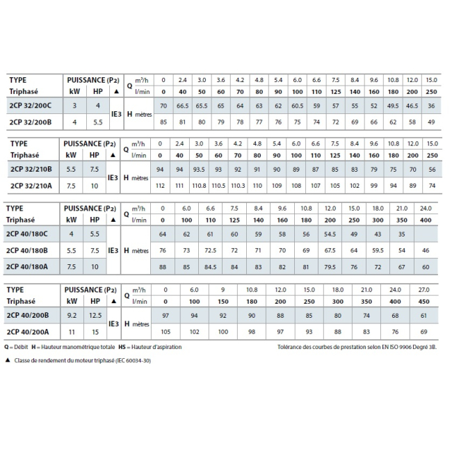 - Débit : 6 à 27 m3/h - Pression : 6 à 9.5 bars - Puissance : 12.5 CV Tri