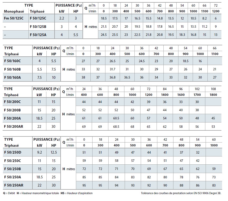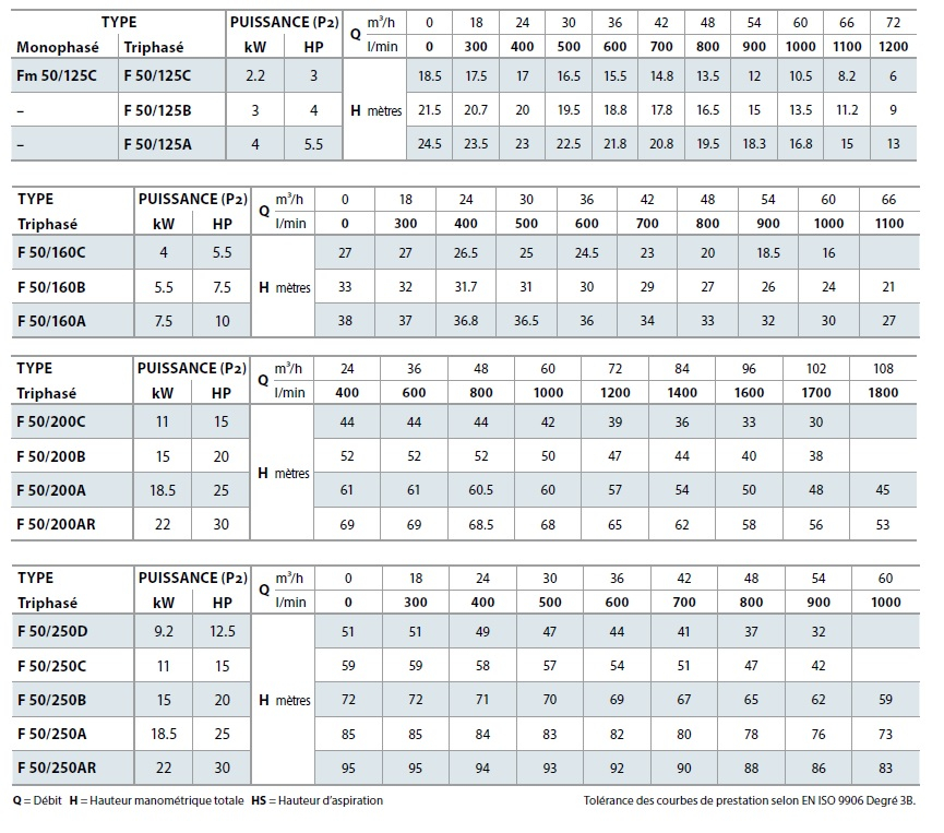 | Type de pompe de surface | F 50 (24 à 102 m3/h) |