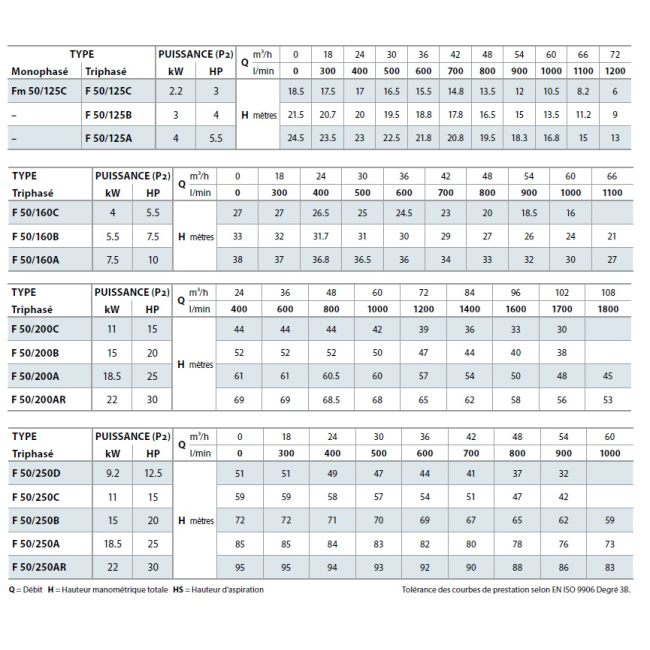 | Type de pompe de surface | F 50 (24 à 102 m3/h) |