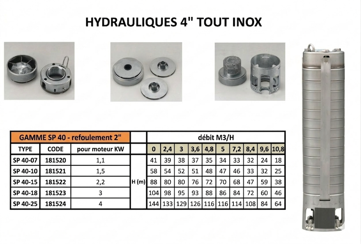 - Matériaux : Hydraulique "Tout Inox" (corps, turbines, diffuseurs)