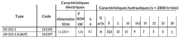 Débit : 2 à 28 m3/h - HMT : 1 à 13 m - Puissance : 1.36 Kw - Mono