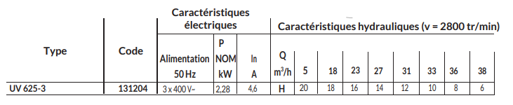 Débit : 5 à 38 m3/h - HMT : jusqu'à 20 m - Puissance : 2.28 Kw - Triphasée