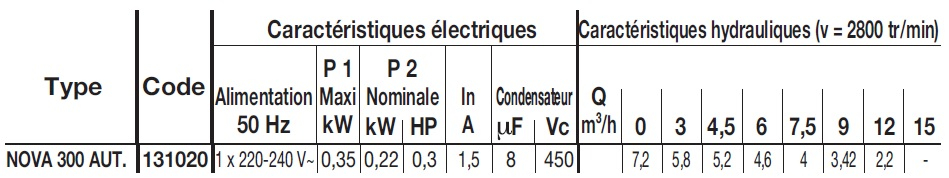 Débit : 3 à 12 m3/h - HMT : 2.2 à 5.8 m - Puissance : 0.22 Kw - Mono - Automatique