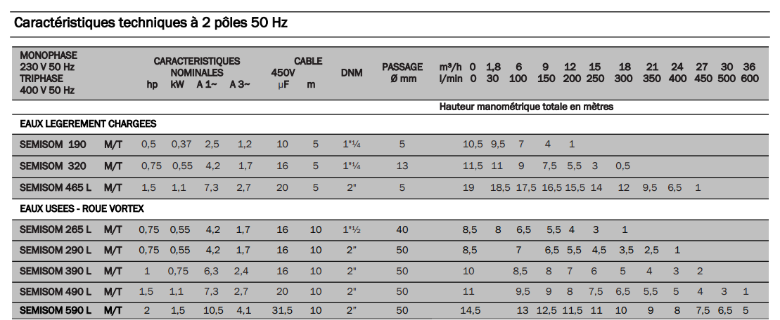 - Matériaux : Corps de pompe en fonte et enveloppe moteur en acier inoxydable AISI 304