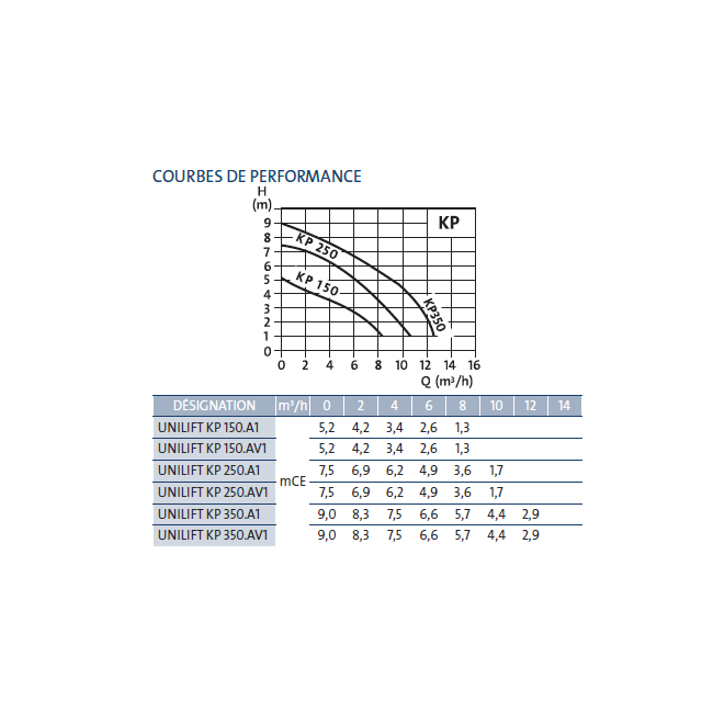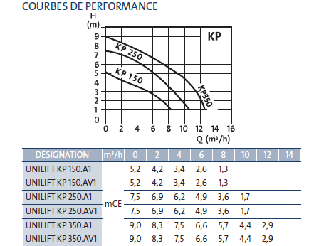 | Pompes de relevage | KP 150AV1, KP150 A1, KP 250 A1, KP 250AV1, KP 350 A1, KP 350AV1 |