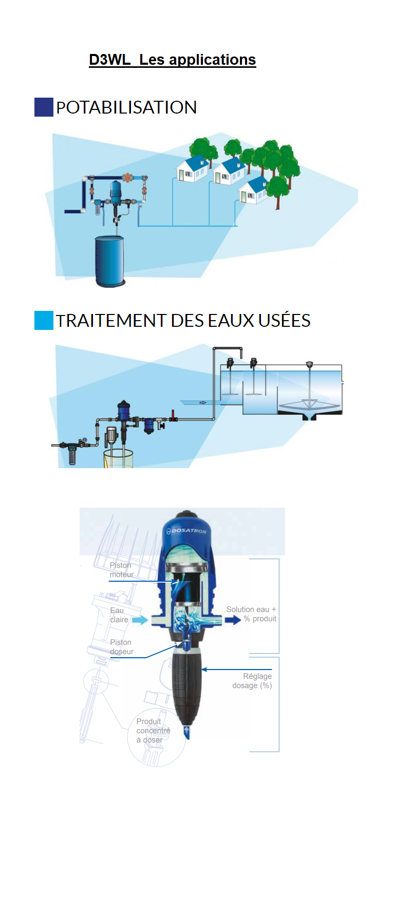 La pompe doseuse D3WL2 Dosatron permet de traîter jusqu'à 3000 l/h de liquide. De conception optimisée, elle s'installe sur le réseau d'eau et utilise la pression de l'eau comme seule force motrice. Une fois actionnée elle aspire le produit traitant au dosage demandé pour l'injecter dans l'eau motrice. L'injection à l'entrée assure une homogénéité de mélange optimale à la sortie. Le modèle D3WL2 est recommandé pour injection d'hypochlorite de calcium ou de sodium. Il est utilisé pour les secteurs; potabilisation et traitement des eaux usées.