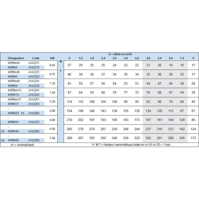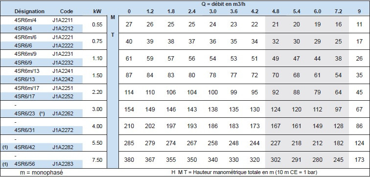 | Type de pompe immergée | 4SR10 (2,4 à 15 m3/h) |