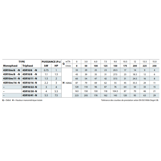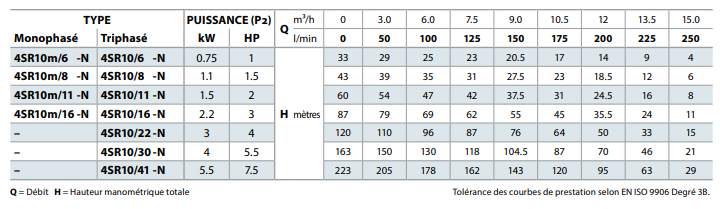| Type de pompe immergée | 4SR10 (2,4 à 15 m3/h) |
